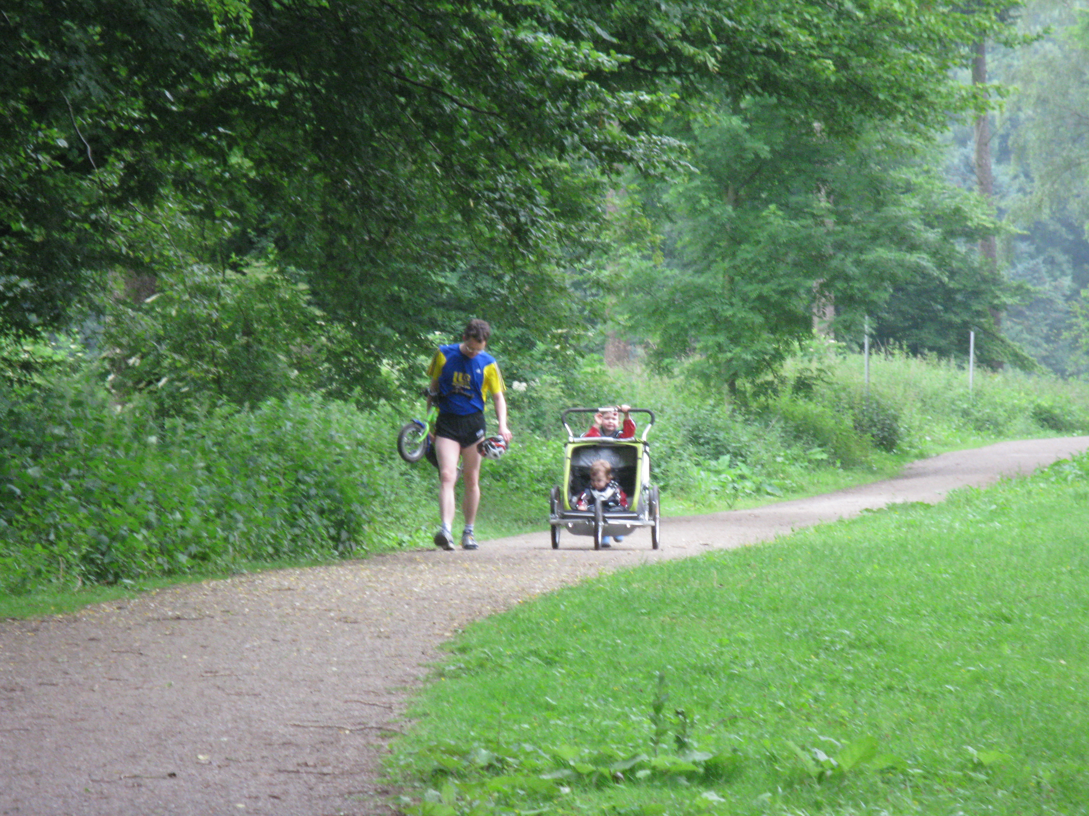 Damit auch junge Familienväter wie Jens und Lutz mit dabei sein können, sind Transportmittel für die Kleinen erlaubt. Aber nicht immer geht es ohne technische Pannen schon kurz nach dem Beginn des Laufes ab- und zwingt zur unfreiwilligen Rückkehr und erneutem Einzelstart.