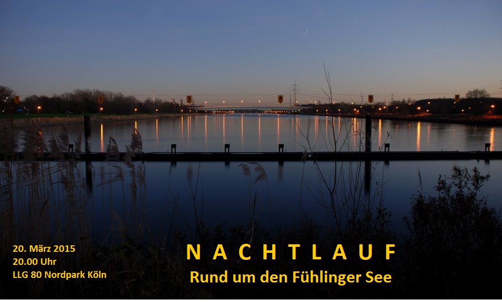 Die LLG 80 bietet am Freitag, den 20.03.2015 um 20.00 Uhr bei völliger Dunkelheit einen Nachtlauf rund um den Fühlinger See an. Der 7,5 Kilometer lange völlig verkehrsfreie Rundkurs auf den naturnahen Laufwegen rund um das Naherholungsgebiet wird mit Fackeln ausgeleuchtet, wo dies notwendig ist. Der Lauf wird ohne Zeitmessung durchgeführt. Wir sprechen hiermit auch die Läufer und Läuferinnen an, die ohne Druck mit Freunden zusammen entspannt als Team laufen möchten und die besondere Stimmung geniessen möchten.
