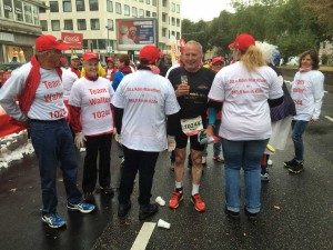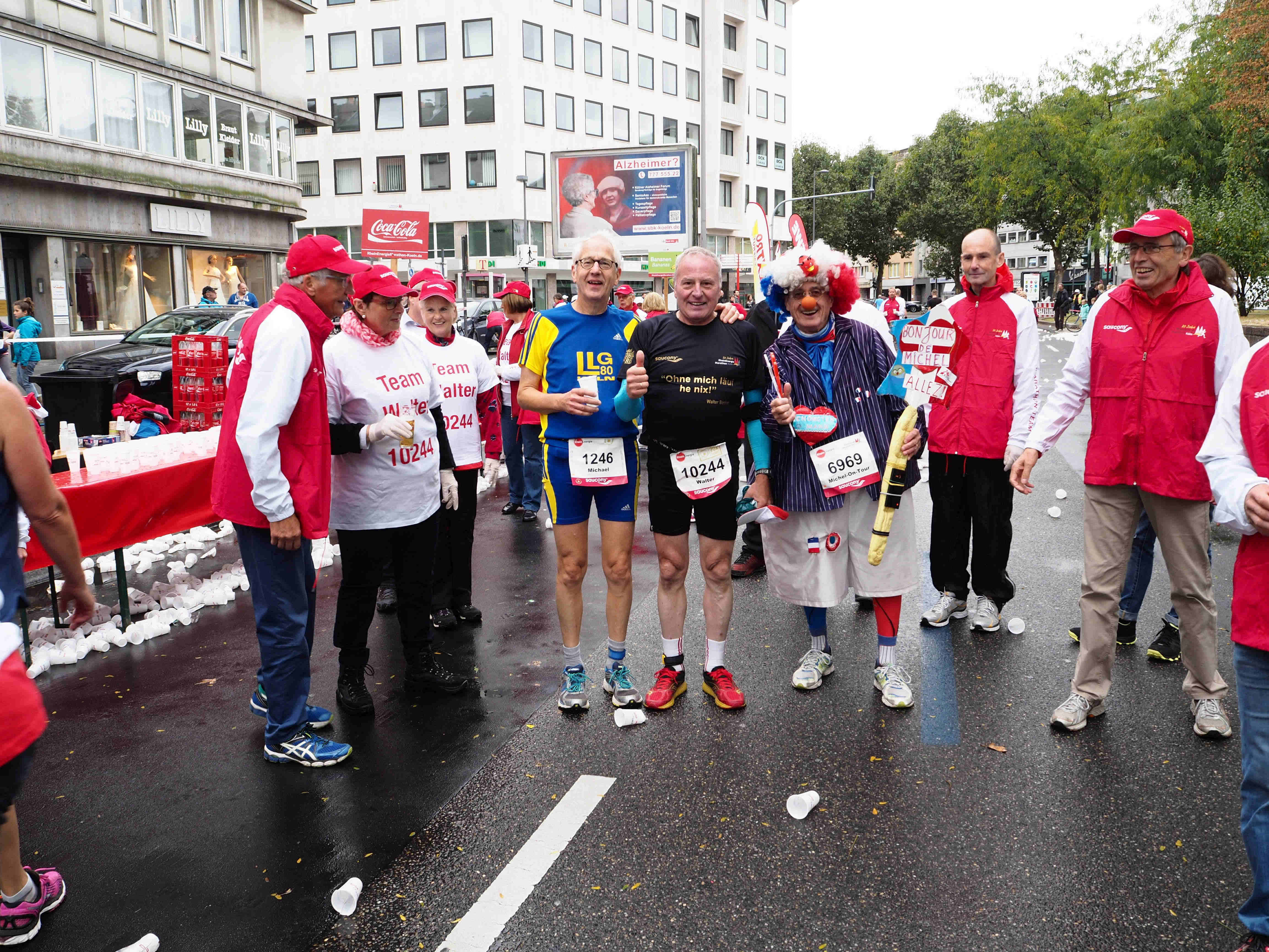 Hier machten wir Pause, Walter wurde fotografiert und bekam ein Kölsch. Sein Bruder entfernte seine Laufjacke und auf seinem T-Shirt stand: Team Walter 10244. Seine Familienangehörigen hatten das gleiche Trikot an.