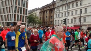 Vom Ebertplatz stadtauswärts hatten wir dann die langweiligste Passage zu bewältigen: In der Xantener Straße fängt das Elend an, dann den Weg zurück – nicht sehr motivierend- die Neusser Straße, wo Dieter Grote Walter um den Hals fiel und uns mit “ihr schafft das” wieder ein wenig Wind unter die Flügel gab. Weiter dann der Niehler Kirchweg, die Friedrich-Karl- Straße mit Gehpausen zur Amsterdamer Straße, wo wir Edith uns entgegen kommend vermuteten. Aber die war schon weit weg. Zwischendurch die Erkenntnis von Walter: “Wer so viele Pausen benötigt, sollte eigentlich keinen Marathon mehr laufen.” Das spricht mir aus der Seele und mein nächster Lauf beim Köln- Marathon am 1. Oktober 2017 ist die Halbmarathon- Distanz.
