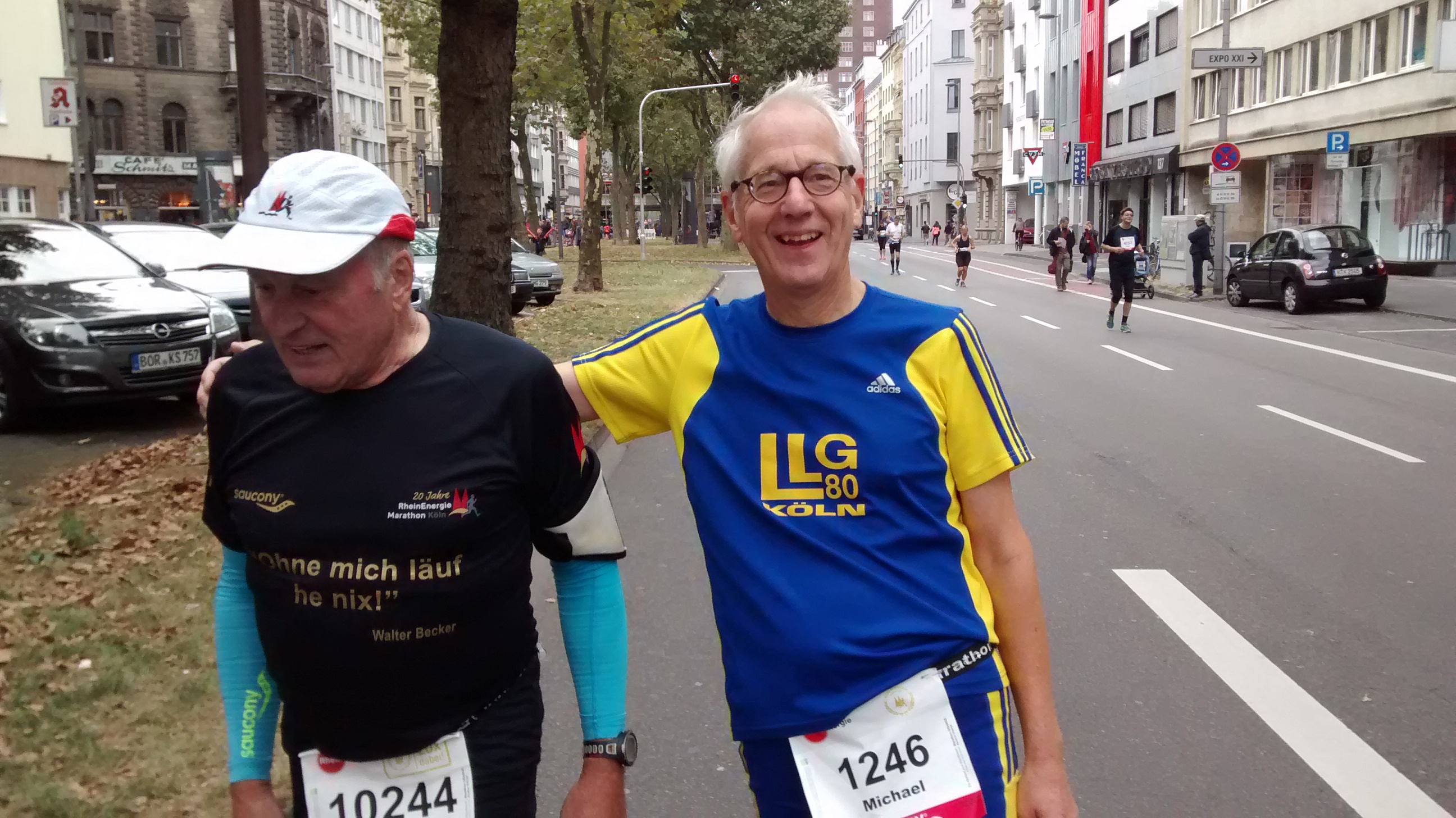 Ich wollte ja eigentlich keinen Marathon mehr laufen, aber als Walter an seinem Vorhaben fest hielt, seinen 20. Köln- Marathon zu absolvieren,- ich hatte Ende August wegen seiner Luftprobleme und relativ schlechten Ergebnisse vorsichtig nachgefragt, ob er sein Vorhaben denn wirklich durchziehen wolle, man könne sich bis Anfang September noch für den Halbmarathon gegen eine Gebühr um entscheiden, erwiderte Walter, dass er den Marathon laufen wolle – wollte ich ihn dann doch unterstützen.