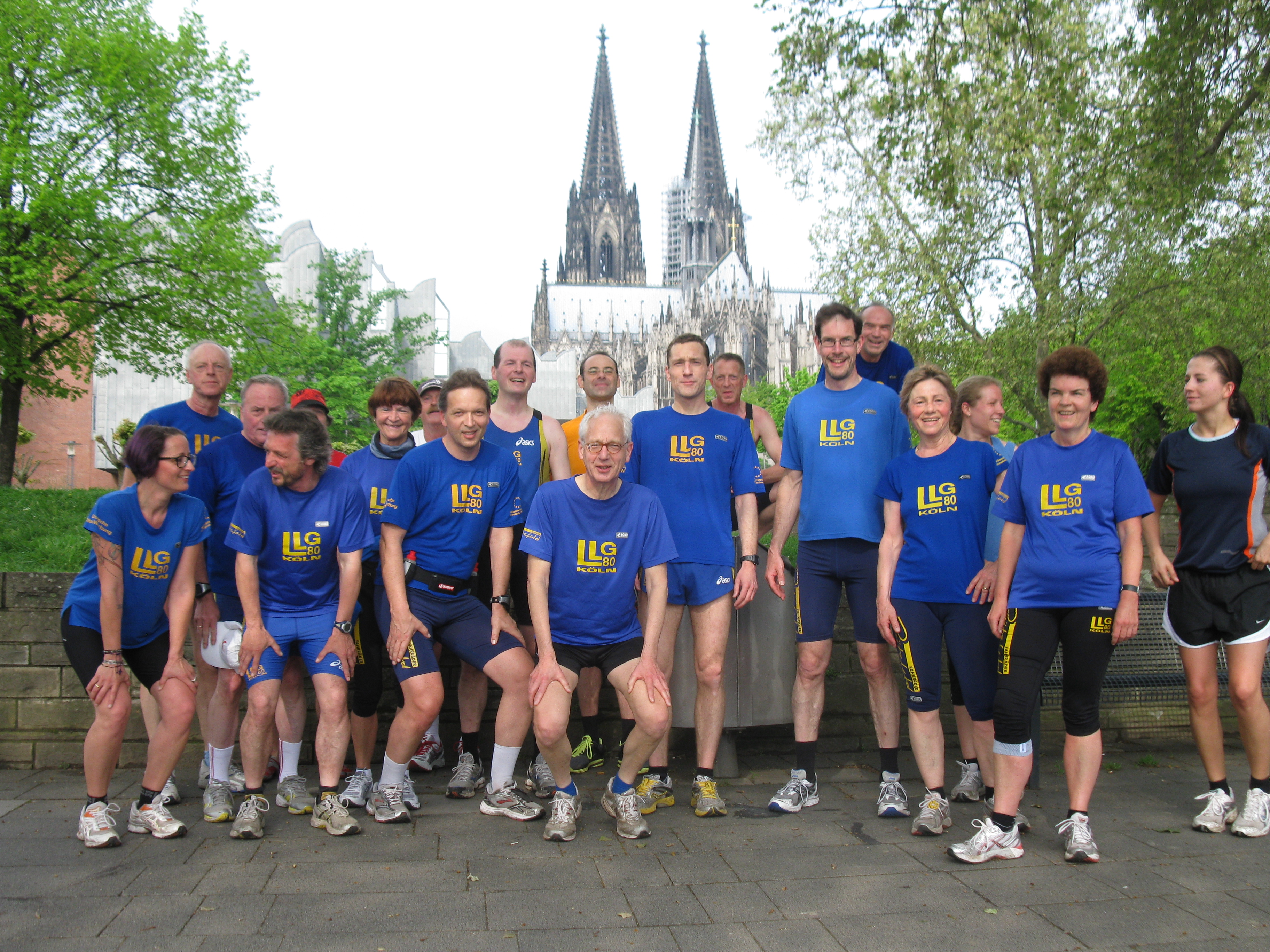 Noch am frühen Morgen hatte es geregnet, vor dem Start zum alljährlichen Marathon war es dann aber trocken und das Wetter spielte sehr gut mit, als wir 27 Aktive uns auf den Weg “Rund um den Colonius” machten. Zu Fuß oder auf dem Fahrrad, mit einem Auto als Transportmittel für Taschen, trockene Kleidung, Verpflegung für unterwegs (Danke, Dieter!) begann der Lauf am Parkplatz und führte über die Niehler Hafenbrücke zum Rhein.