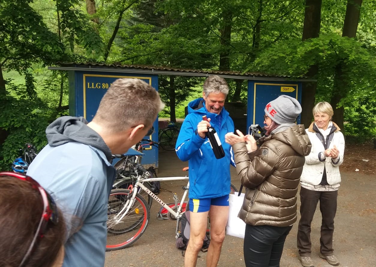 Im Ziel am Nordpark wurden dann neun Läuferinnen und Läufer sowie vier Radbegleiter erwartet; fünf Läufer hatten die komplette Distanz laufend hinter sich gebracht.