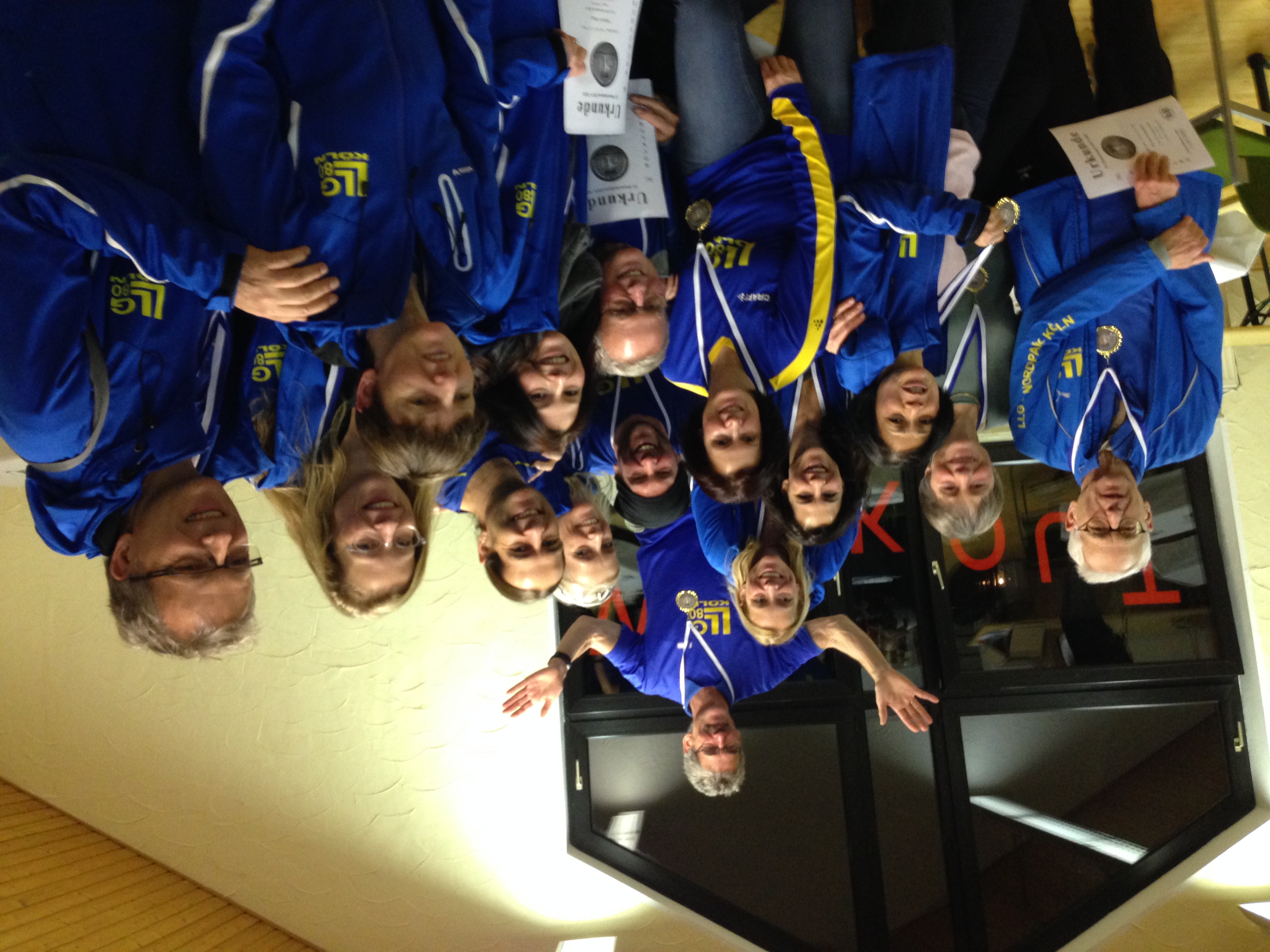 Nach den heißen Duschen mussten alle noch einige Zeit auf die Siegerehrung warten. Das war aber recht kurzweilig, denn die Veranstalter hatten einerseits mit leckerem Imbiss und Getränken vorgesorgt, andererseits wurde eine Festschrift zum 50-jährigen Jubiläum der Winterlaufserie zum Anschauen und Lesen ausgelegt. Welche Überraschung: Auf dem Titelfoto waren einige LLG´ler in Aktion zu sehen, die schönen blau-gelben Laufshirts fielen sofort auf. Zudem gab es noch eine Präsentation vieler Fotos der Serienläufe vergangener Jahre, die ebenfalls unsere rege Teilnahme belegten.