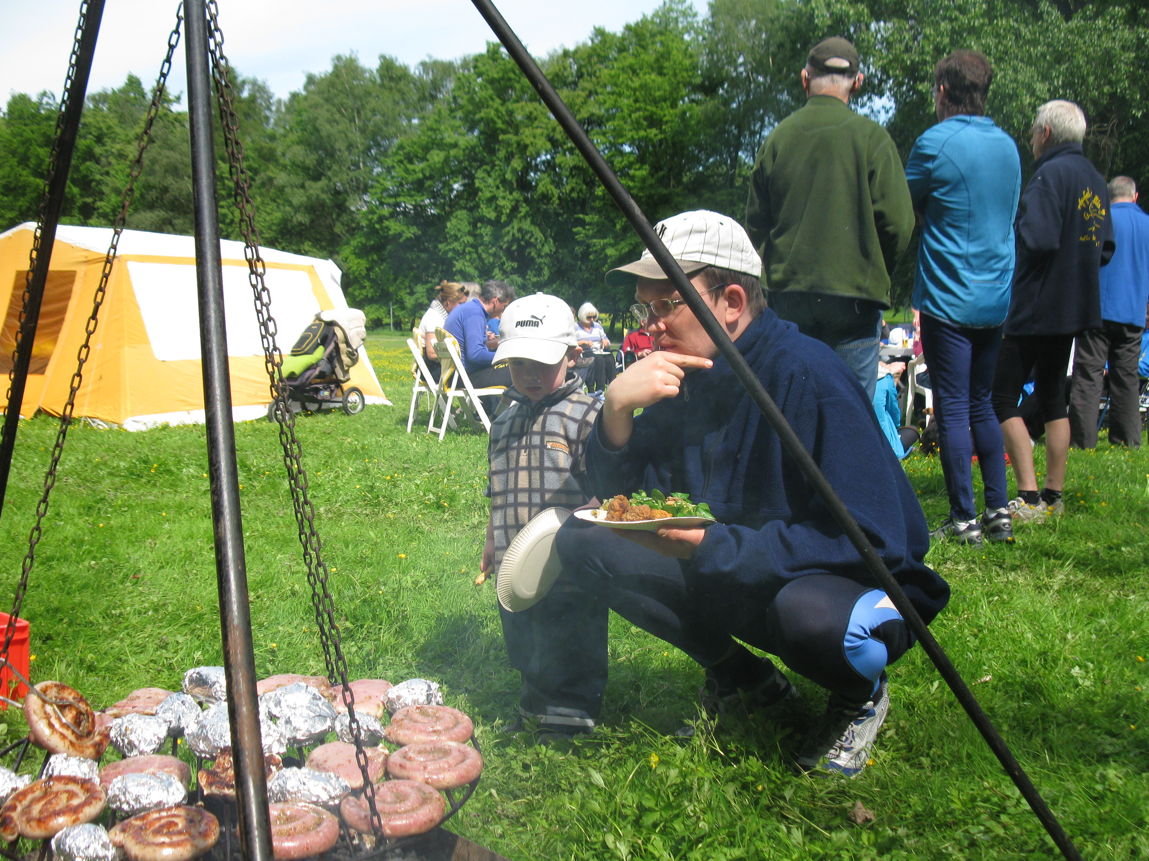 Während die Aktiven liefen, der Zeitnehmer auf das Eintreffen der LäuferInnen wartete, hatte Hans Albers als Grillmeister schon die Glut vorbereitet und Grillgut für über 40 Teilnehmer aufgelegt. Mitgebrachte Salate und Frikadellen sowie Kuchen rundeten das Büfett ab, Winfried Bulla hatte aus Anlass seines 70. Geburtstages das Bier spendiert, wofür wir ihm alle sehr dankten.