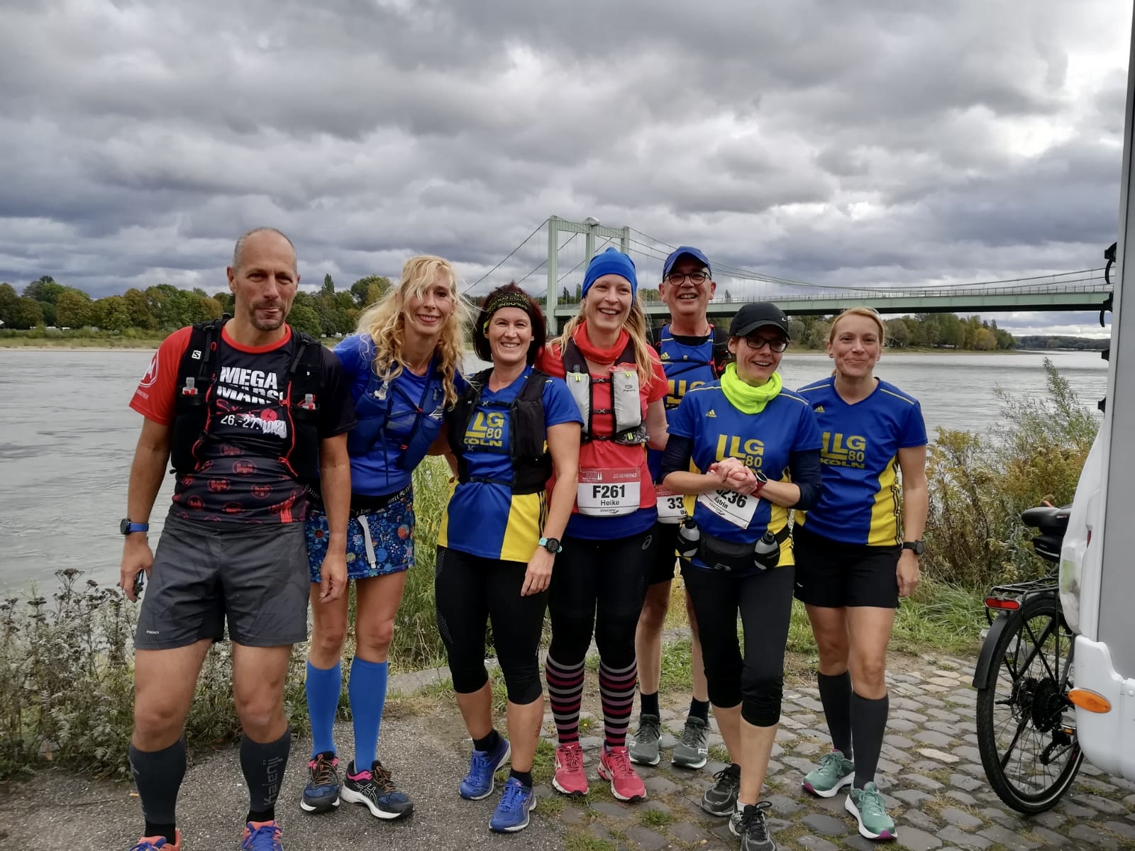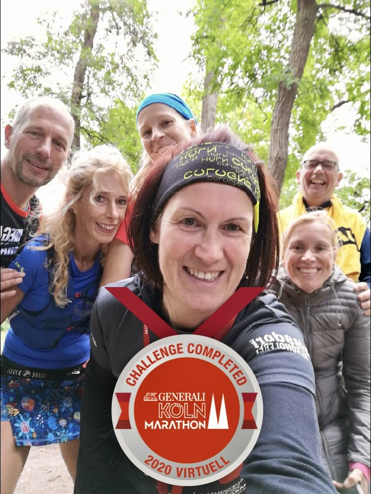 An der Hohenzollernbrücke verließen uns die die Halbmarathonis und zu Siebt, nein, ein Stück weit mit Rudolf an unserer Seite zu acht, gings weiter auf Marathonkurs, vorbei an vielen Gleichgesinnten, die ebenfalls virtuell unterwegs waren. Es machte jedes mal Spaß, sich gegenseitig zu beklatschen und anzufeuern.