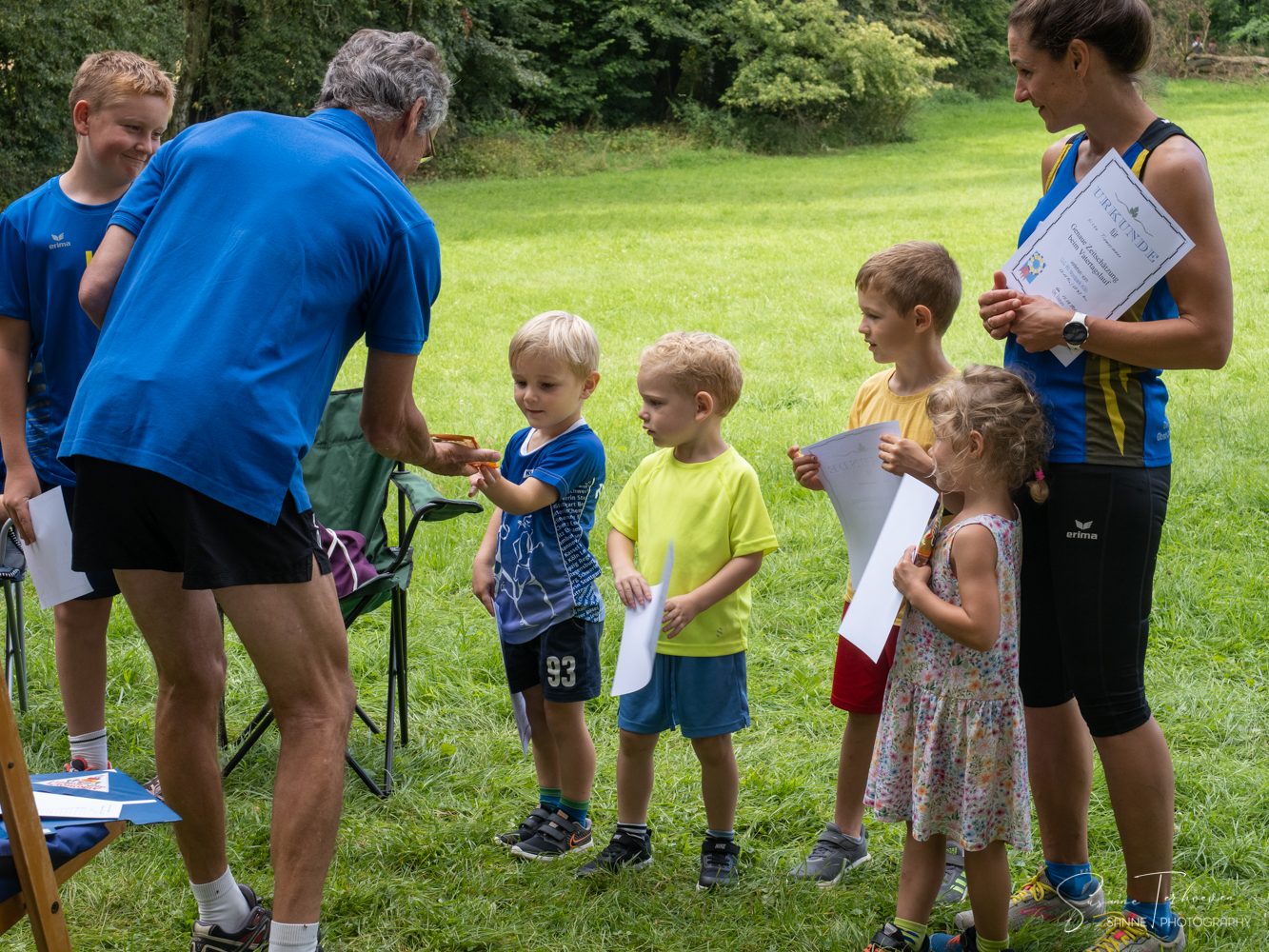 Nach dem Lauf der Erwachsenen starteten die Kinder zu ihrem Lauf über etwa 400 Meter. Die Eltern fungierten als Streckenposten und so kam der Nachwuchs unter dem großen Applaus der restlichen Läuferschar ins Ziel- in der Reihenfolge Leo, Lukas, Max, Lilli. Sie freuten sich nicht nur über ihre Urkunden, sondern auch über die überreichten Süßigkeiten.