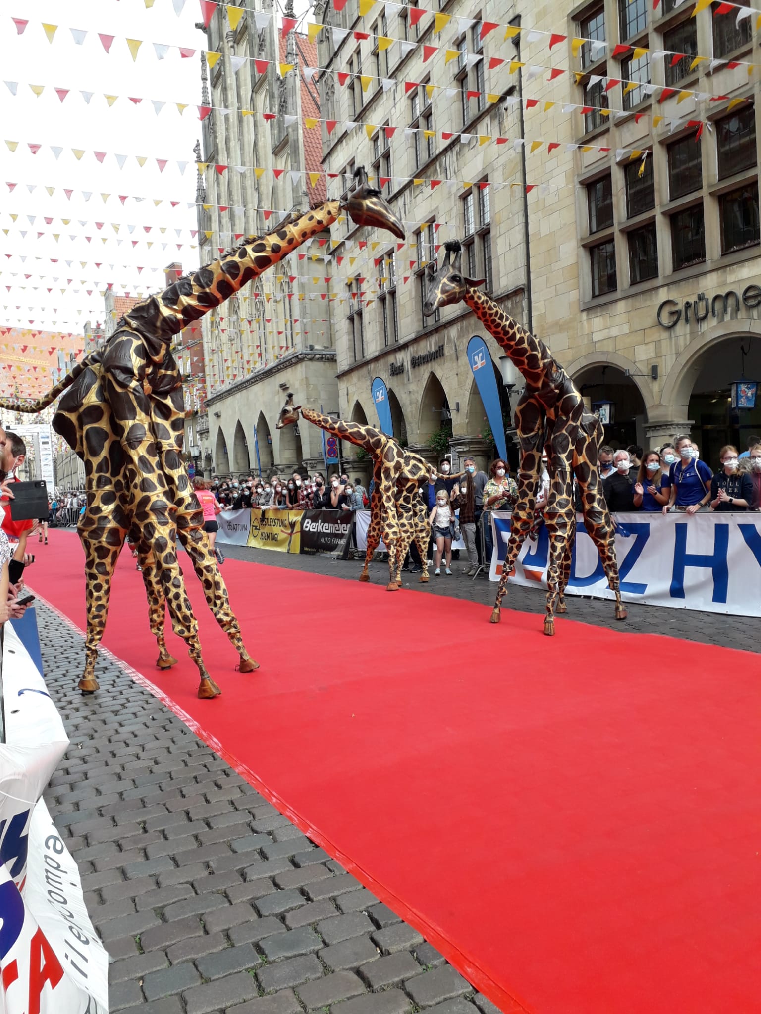 Der „Münster Marathon“ am 12. September: Ich mag die Strecke und die Stimmung. Zunächst ist man ca. 10 Kilometer auf den Pflastersteinen in der Innenstadt unterwegs. Gut, dass man zu Beginn noch fit & aufmerksam ist, diese Stolpersteine zu überwinden. Dann geht’s raus aufs platte Land und durch die Dörfer. Es ist kein Klischee: Radfahrer sind immer unterwegs, zudem ist immer was los, denn die Staffelläufer kommen auf die Strecke und beleben das Geschehen unterwegs. Wenn der Aasee wieder in Sicht kommt, kann man noch einmal Gas geben. Schließlich ist der Zieleinlauf auf dem Prinzipalmarkt besonders bunt: Langer roter Teppich und der Himmel voll bunter Fähnchen.