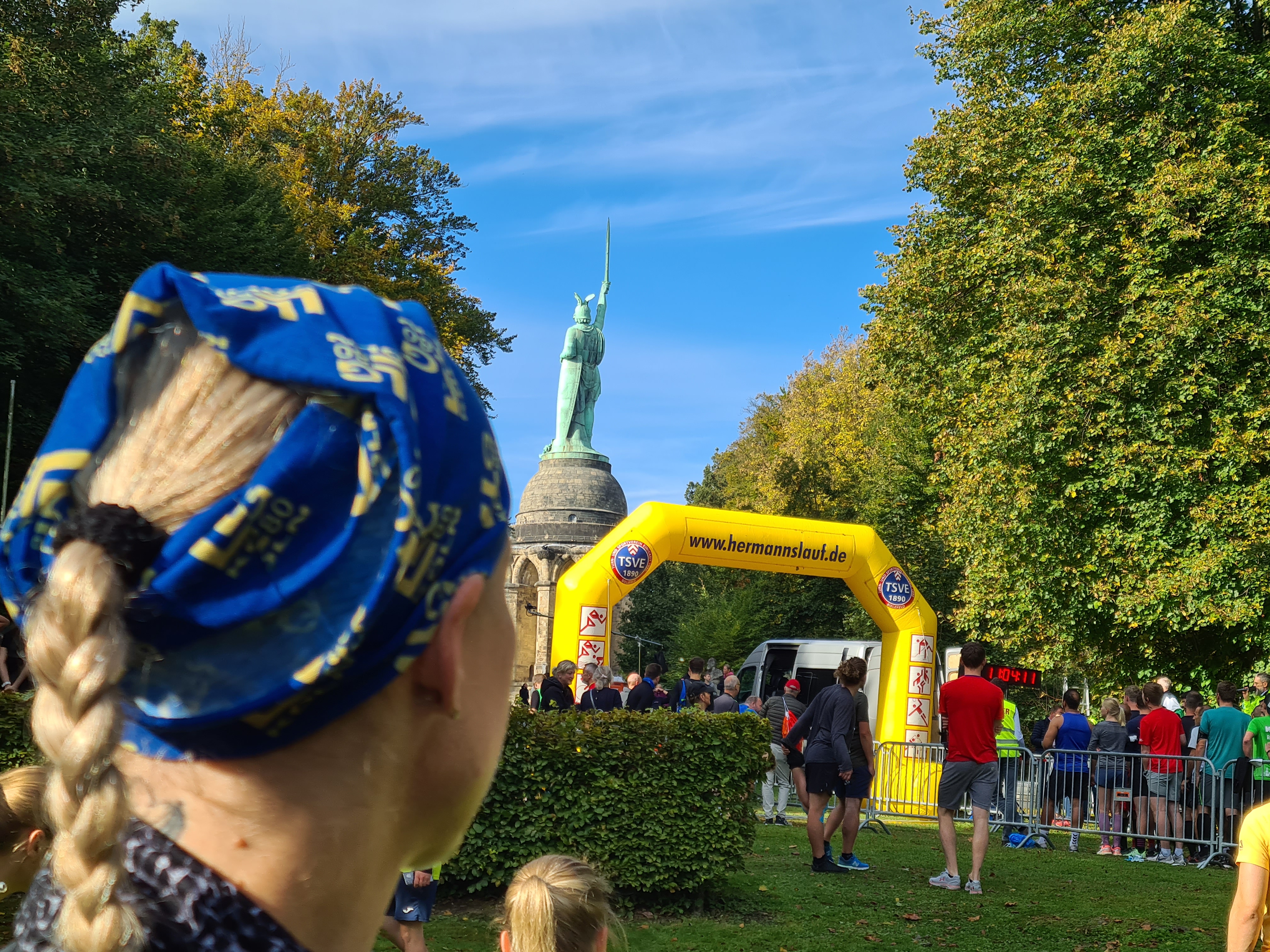„Hermann im Herbst“ geht auch, haben die Veranstalter festgestellt (10. Oktober). Und auch hier wurden alle Läuferinnen und Läufer von der Sonne verwöhnt. Die Höhenmeter und das Gefälle sind ja schön verteilt auf die 31,1 Kilometer, sowohl die wunderbaren Treppen im Wald, als auch in Oerlinghausen – natürlich über Pflastersteine – bergab. Auch gleich zu Beginn geht es über ‚Stock und Stein‘; denn teilweise sind die Waldwege arg mitgenommen. Grund sind wohl die Forstarbeiten mit großem Gerät. Ja, das Streckenprofil ist schon eine Herausforderung und da mir das Hügeltraining fehlte, war das Ergebnis ein wirklich fieser Muskelkater in den Oberschenkeln.