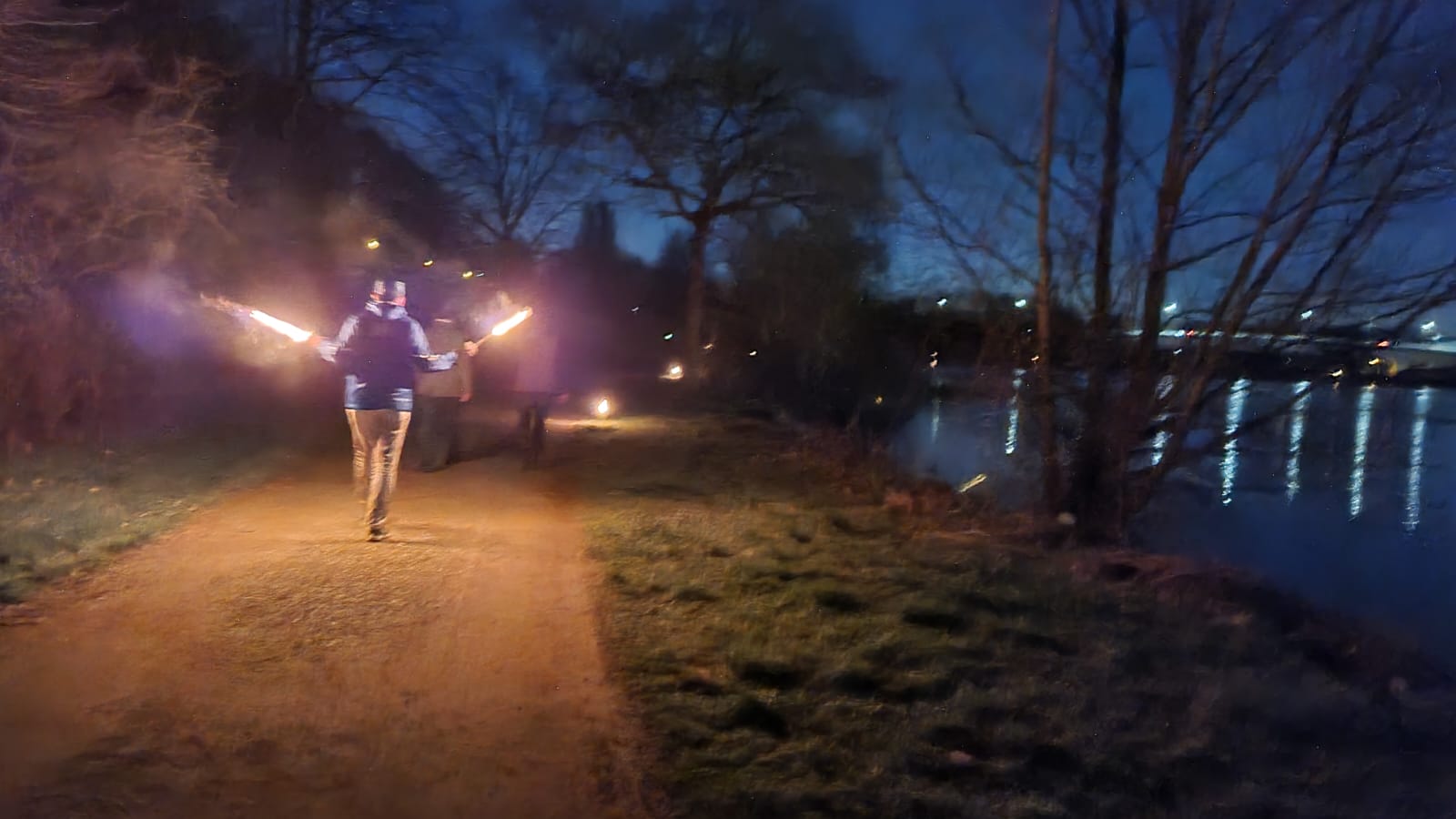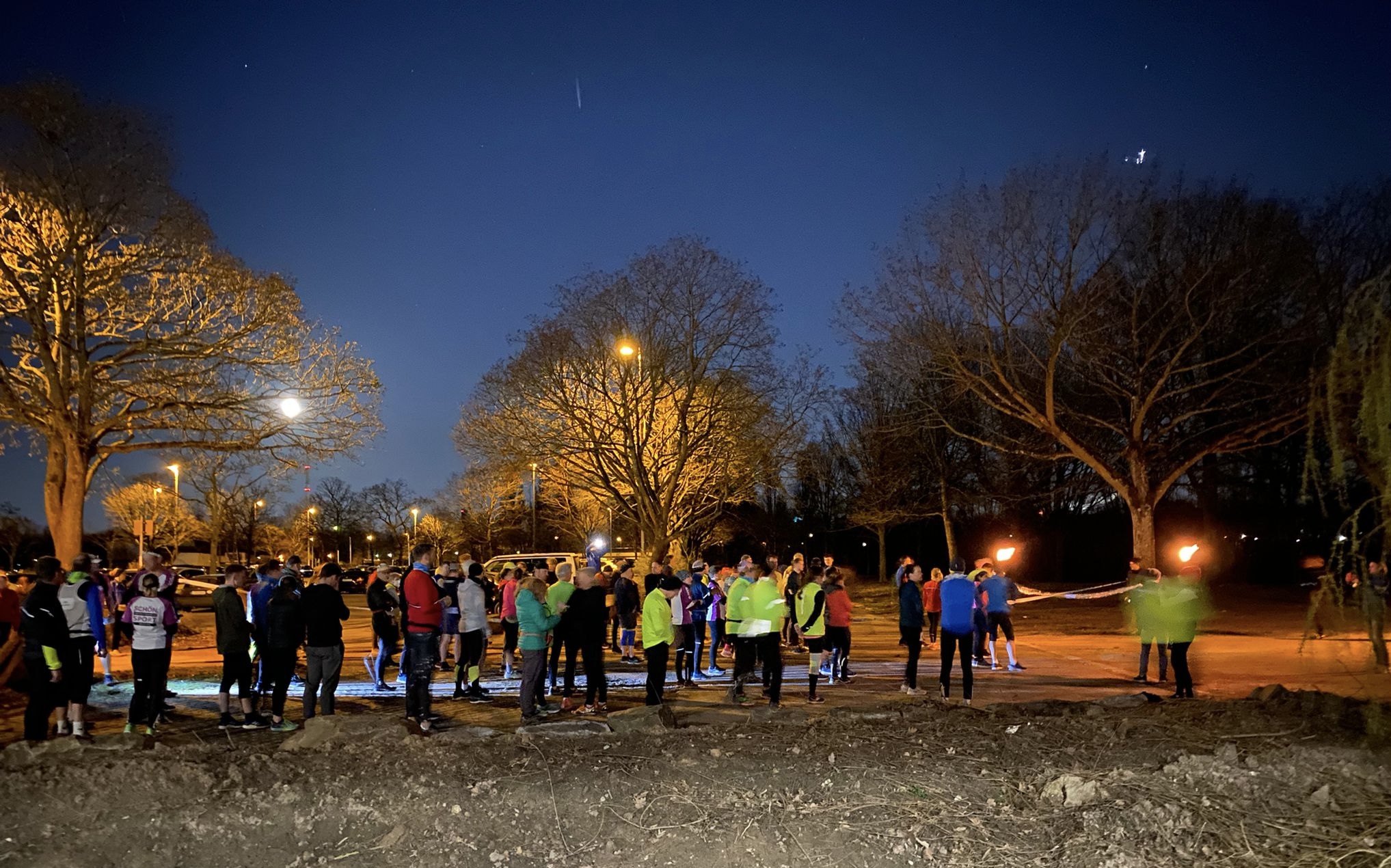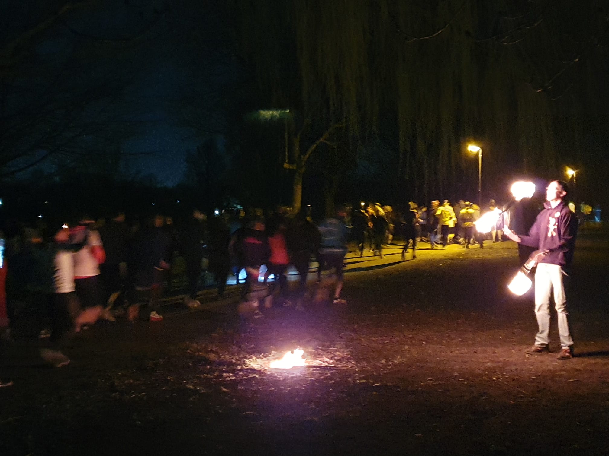 Das Naherholungsgebiet Fühlinger See ist immer einen Ausflug wert – aber eingebettet in eine Vollmondnacht im März mit Fackelschein bietet der See die perfekte Kulisse für unseren Nachtlauf. Pünktlich wurde das Läuferfeld auf die Strecke geschickt. Direkt nach dem Start und dann wieder zum Ende begeisterte eine Fackeljonglage alle Aktiven und die mitgereisten Fans.