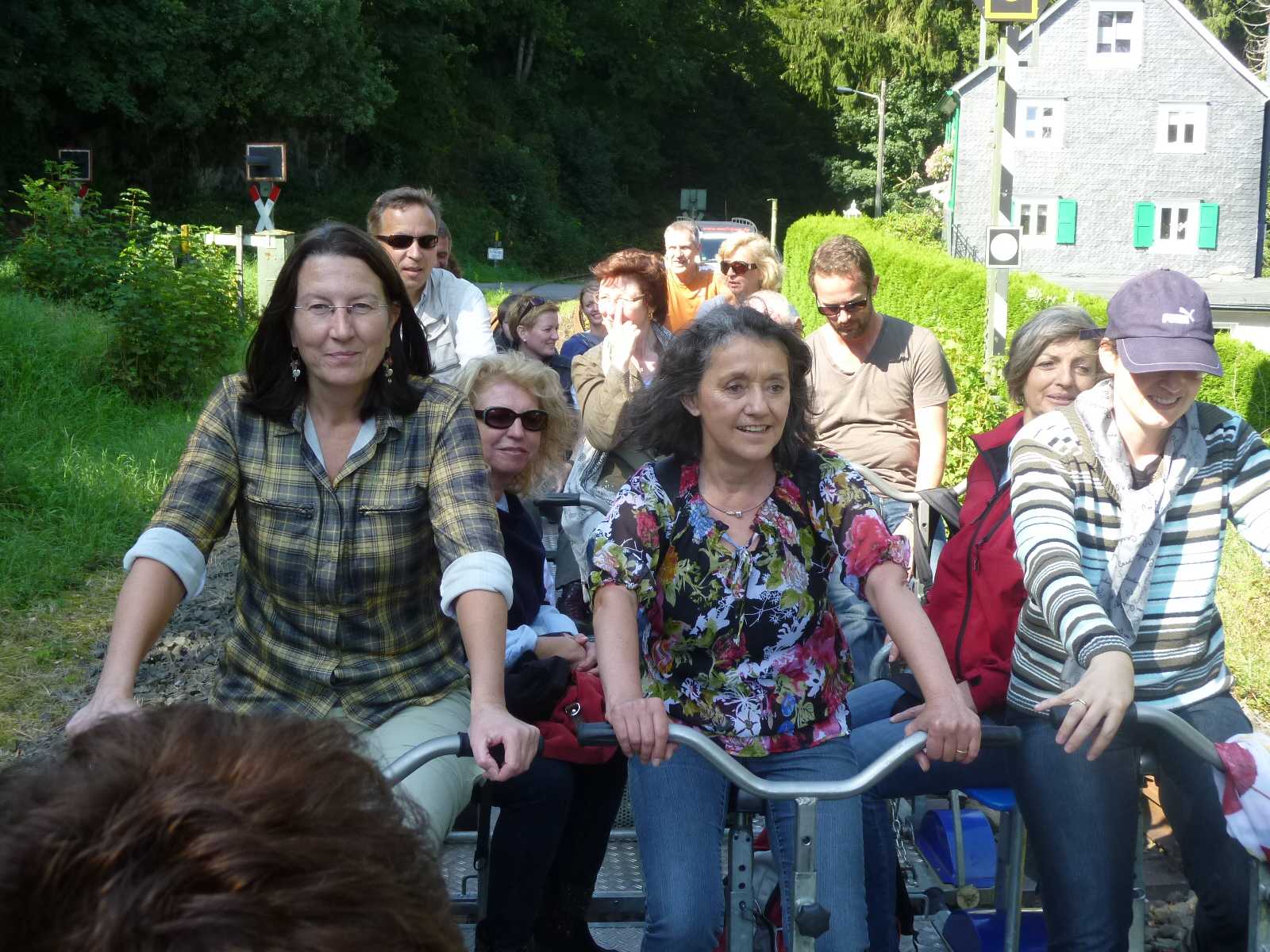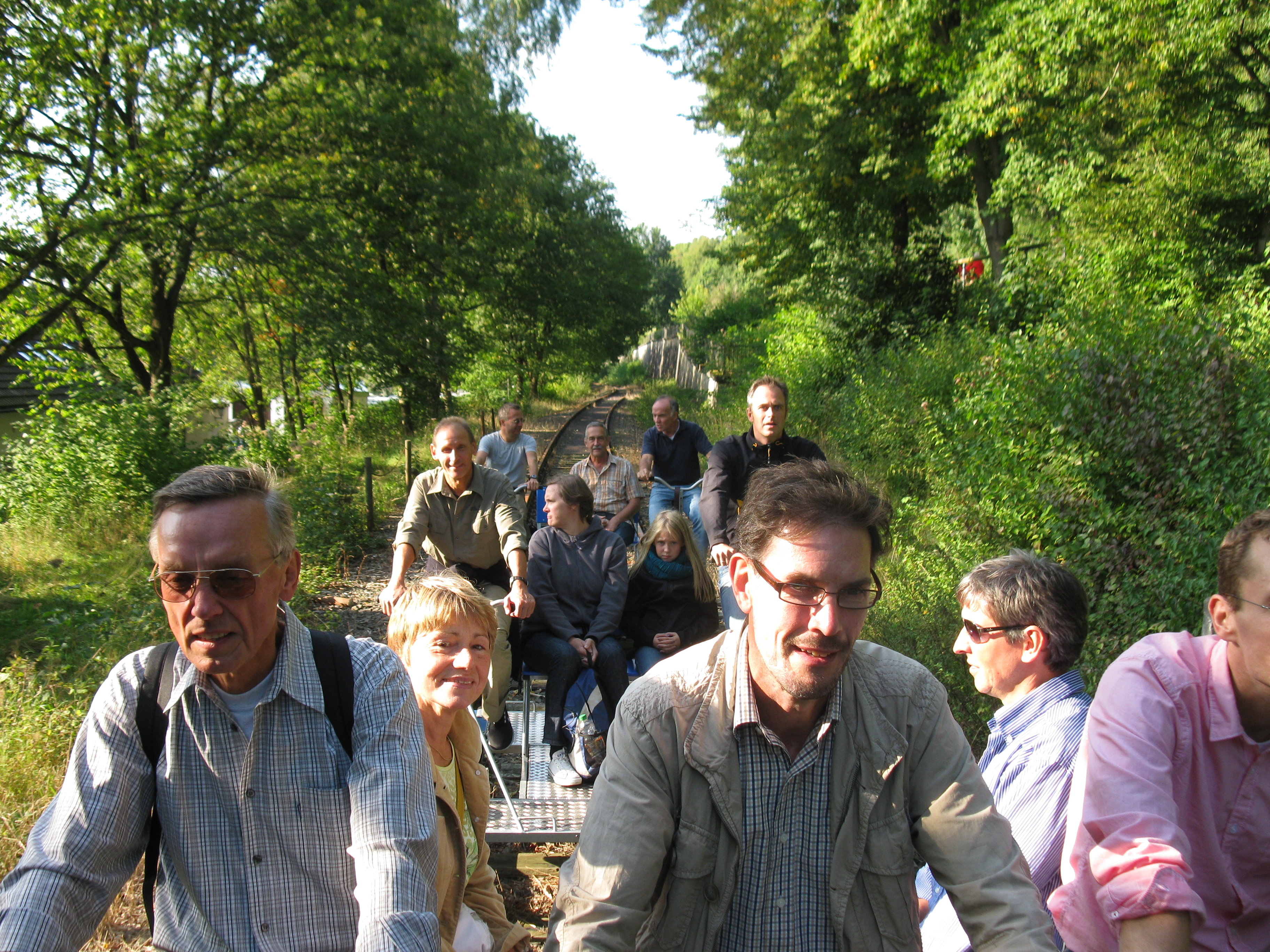 Beim Vereinsausflug am 16.09.2012 hatten wir uns eine sehr spezielle Art der Fortbewegung ausgesucht: In Dahlhausen nahe Radevormwald benutzten wir Draisinen für eine gut 90-minütige Fahrt über eine stillgelegte Bahntrasse.