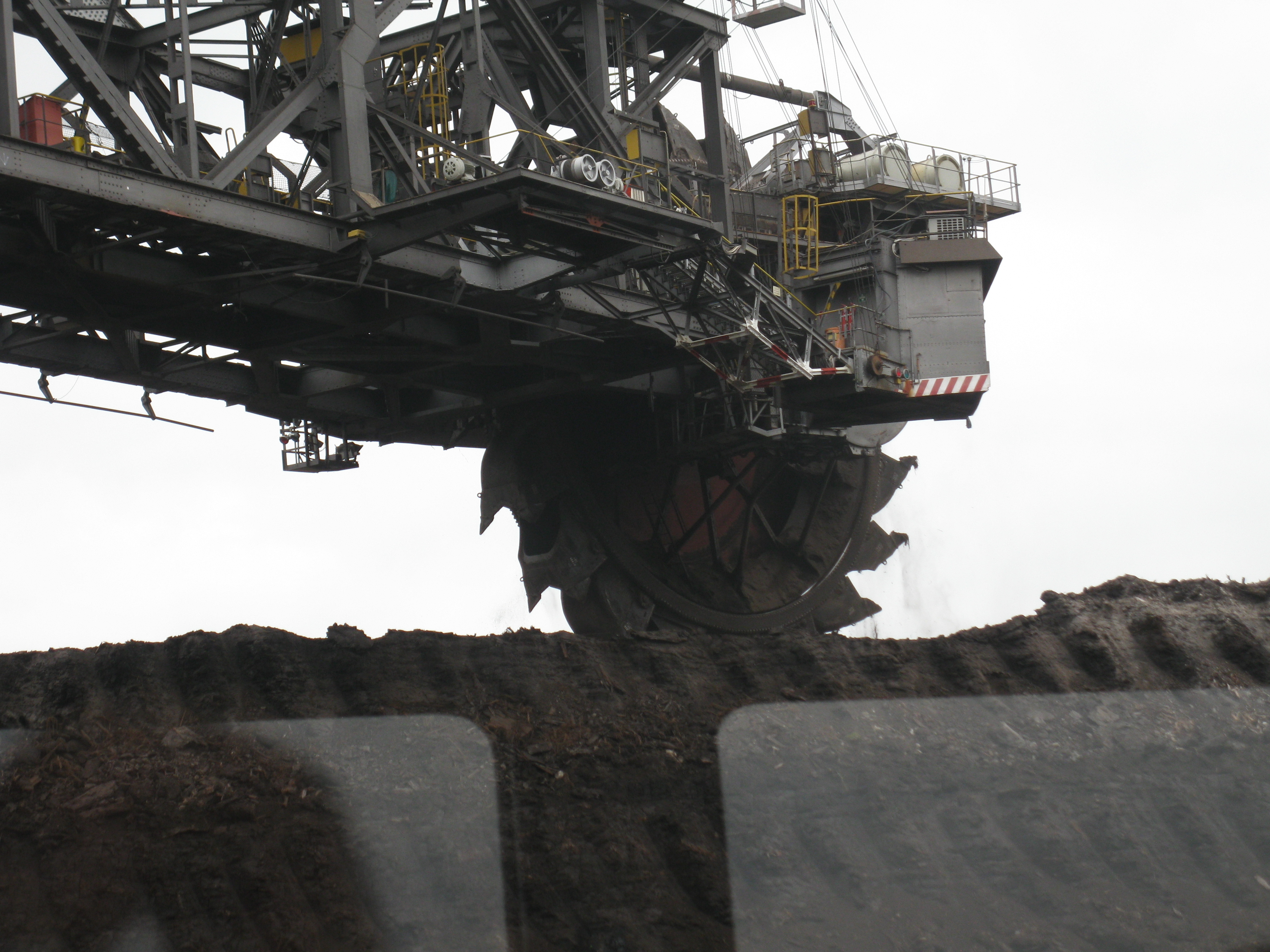 der uns dann bis mitten in den Tagebau auf die unterste Sohle, die den Kohleflöz ausmachte, transportierte. Dort stand dann unser Bus direkt neben einem solchen Riesenschaufelbagger bei der Arbeit. Seine gewaltigen Schaufeln fraßen sich in die Braunkohleschicht und der Inhalt dieser Schaufeln wurde dann auf das Fließband abgesetzt. Aus dem Fernsehen kannten wir diese Bilder, aber “in Echt”, in unmittelbarer Nähe so etwas zu erleben, war schon beeindruckend.